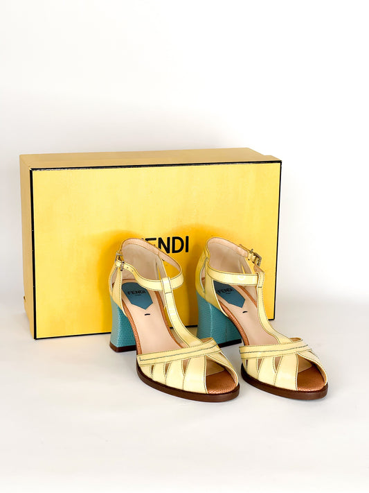 Fendi Cut-Out Patent Leather And Lizard Block Heel Peep Toe Sandals Size 36