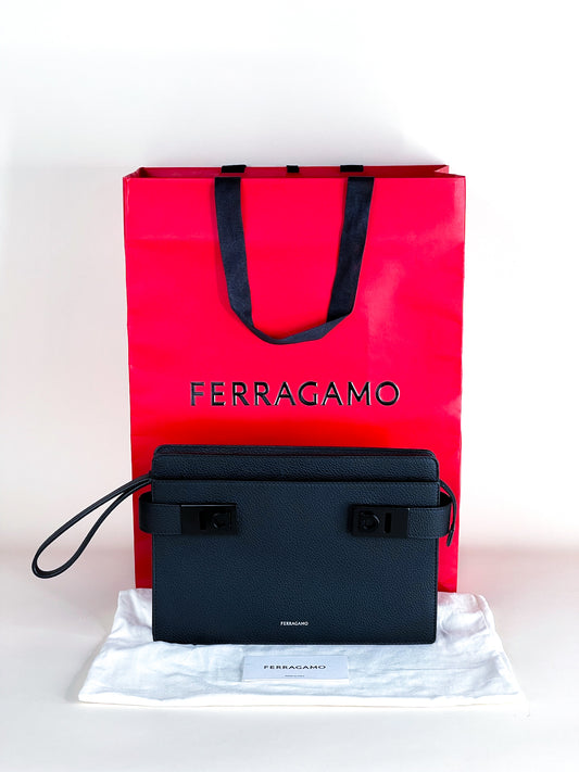 Ferragamo Pouch With Gancini Buckles Hammered Calfskin Black