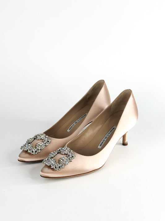 Manolo Blahnik Hangisi 7cm Pumps in Champagne Satin with White Crystal Size 36 1/2
